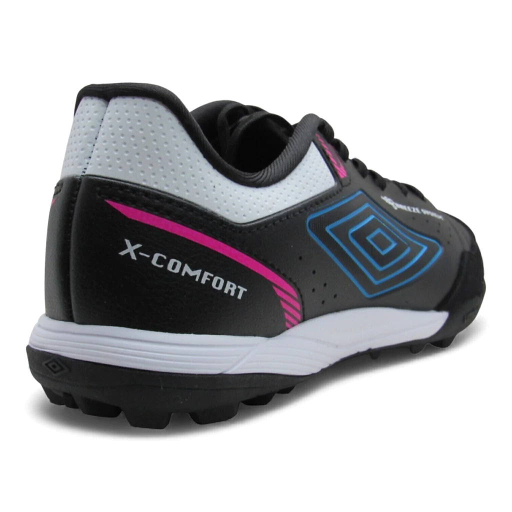 El Botín Umbro X-Comfort está diseñado para brindarte máxima comodidad y rendimiento en la cancha. Su sistema BREEZE SYSTEM incorpora perforaciones estratégicas que mejoran la ventilación, manteniendo tus pies frescos durante el juego. La plantilla interna de EVA X-Comfort y la suela completa del mismo material ofrecen una amortiguación suave y estable en cada pisada. Construido en material sintético resistente y con puntera cosida para mayor durabilidad, es una opción ideal para entrenamientos y partidos.